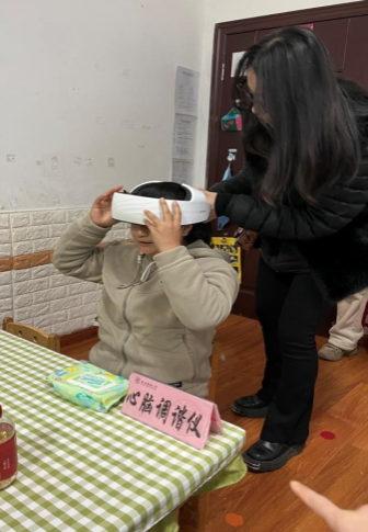 公司特殊教育、应用心理学专业硕士研究生代表深入幼儿班级了解学前融合教育开展情况,为幼儿教师进行心理测评。心理学专业研究生演示心理调适系统、心脑调谐仪、便携心理自助系统和VR设备等心理学仪器,并组织36名幼儿园教职工开展趣味心理测验活动和体验心理仪器。