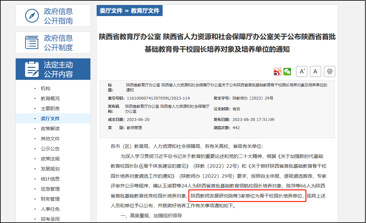 根据《陕西省教育厅办公室陕西省人力资源和社会保障厅办公室关于公布陕西省首批基础教育骨干校园长培养对象及培养单位的通知》(陕教师办〔2023〕29),陕西教师发展研究院入选“陕西省首批基础教育骨干校园长培养单位”,承担领航校园长培养任务。